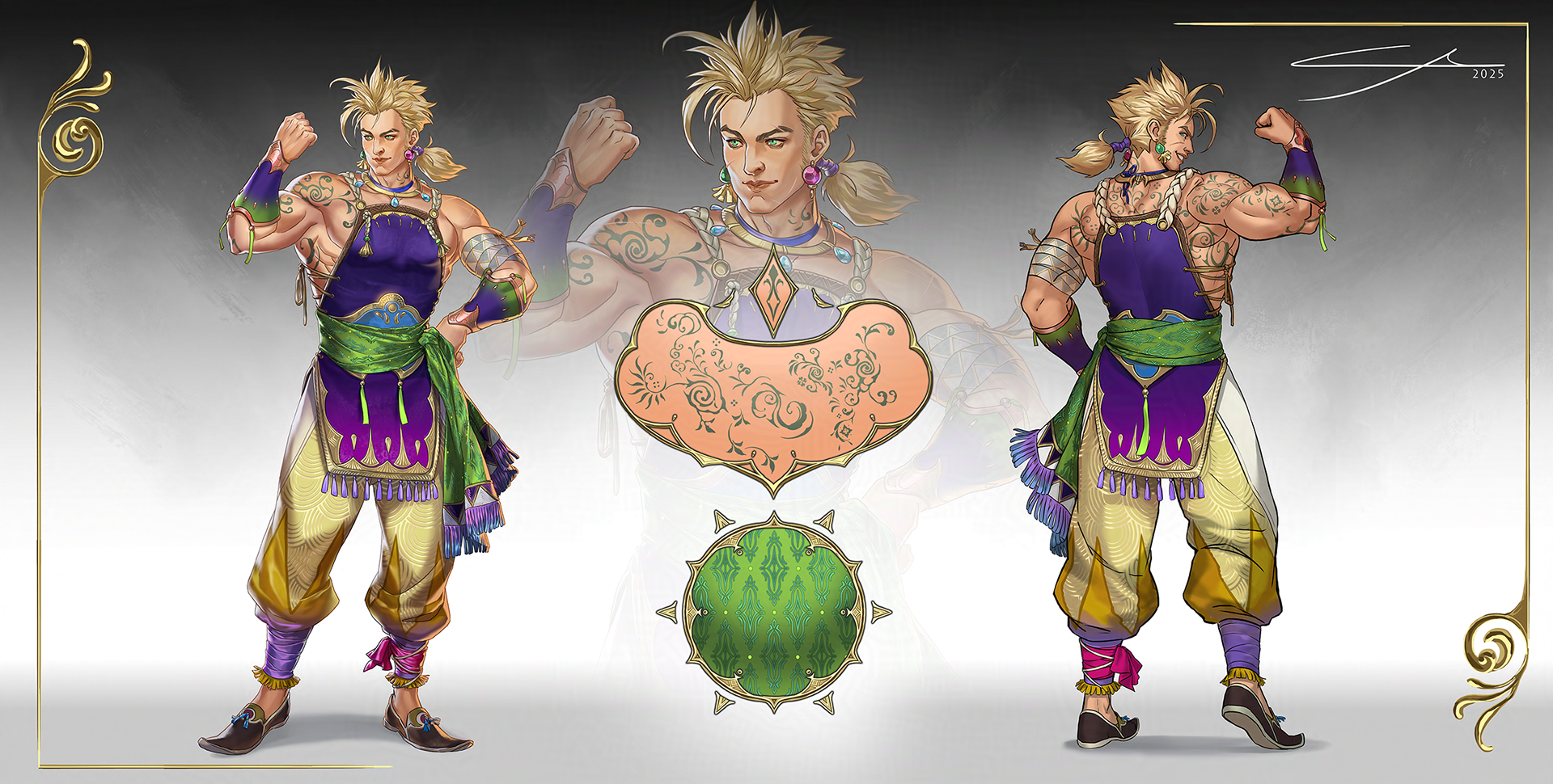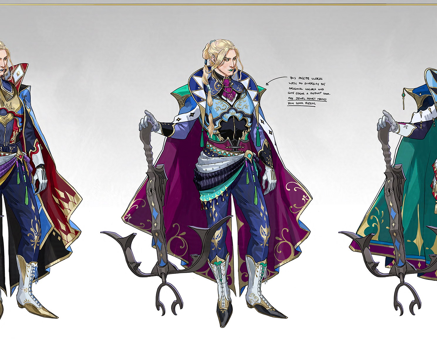 For the iterations the biggest goal was to make him coherent with Edgar, showing the same origins, but adapting to his chosen way of life. For that, I decided to apply similar elements, such as the triangle detailing, and to keep their color palette close, but differing in warm/cold temperatures.