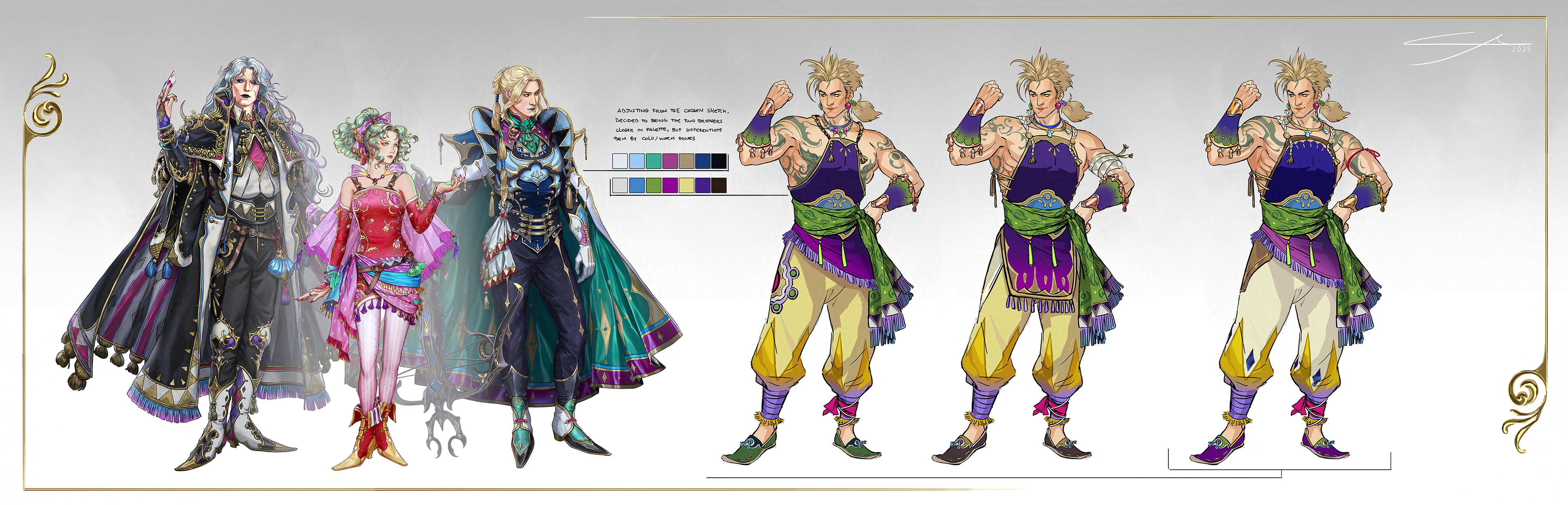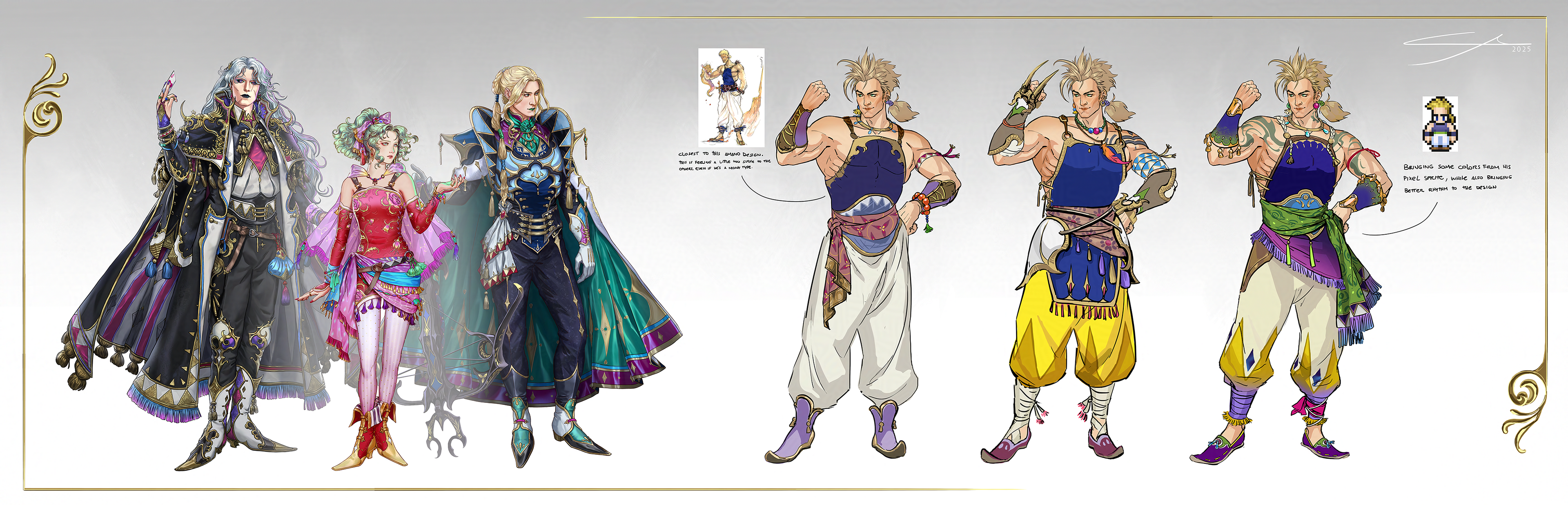 Sketches. For Sabin I decided to stick very close to the original Yoshitaka Amano design for the clothing elements. Working from that point to tie in to the other characters.