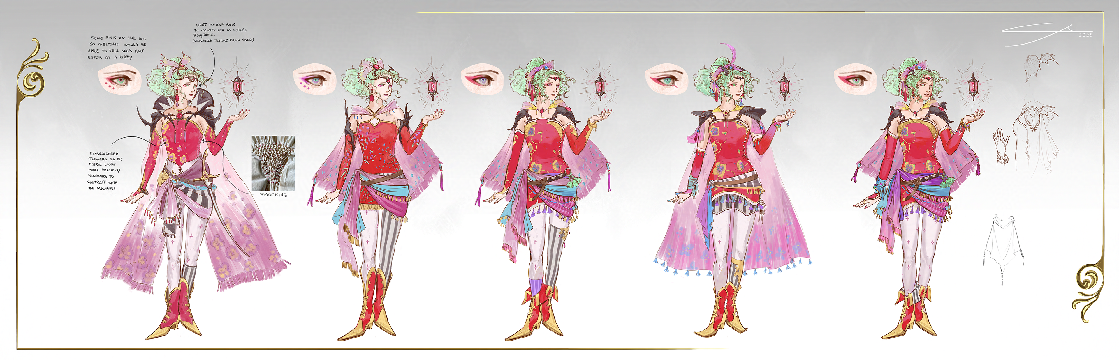 With newfound knowledge from the analysis, I went back to the drawing board and managed to finalize her overall design and move on to pattern ideas for the dress.